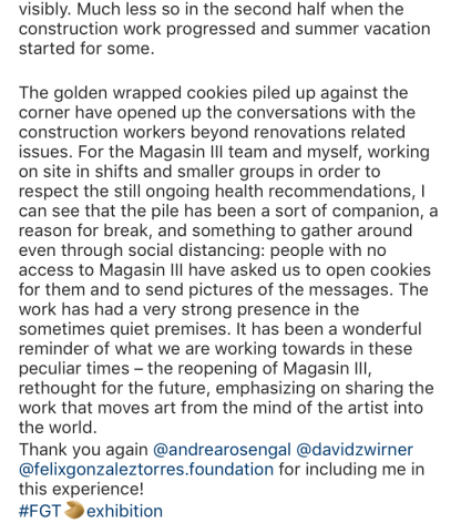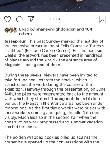 Posted to Instagram on May 25, 2020: "A few weeks ago, I received an invitation by Andrea Rosen Gallery and David Zwirner Gallery in New York to participate as one of up to 1000 “places” around the world in the official installation of Felix Gonzalez-Torres’s “Untitled” (Fortune Cookie Corner), 1990. This expansive exhibition takes place between today, May 25th, and July 5th 2020, and is curated by Andrea Rosen.